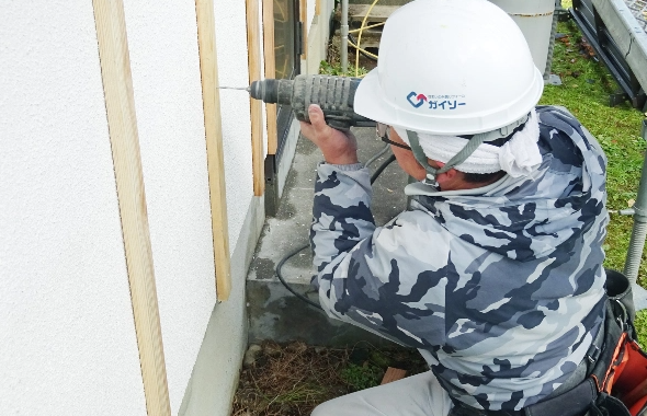 サイディングの内部への雨水の侵入を防ぎ、壁面の防水性を確保するため、見切り縁や土台水切りを取り付けます。